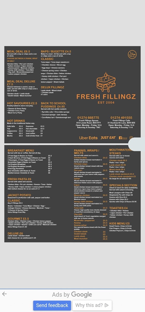 Introducing the menu at Fresh Fillingz Cafe BD9, a cozy gem located at 31 Duckworth Ln, Bradford, you can expect a delightful blend of comfort food and heartfelt service. With a menu that embraces homemade goodness, highlights include the savory Meat Lasagne with Chips and the classic Shepherd's Pie. The Keema dishes, served with either rice or chips, are crowd favorites that showcase robust flavors.