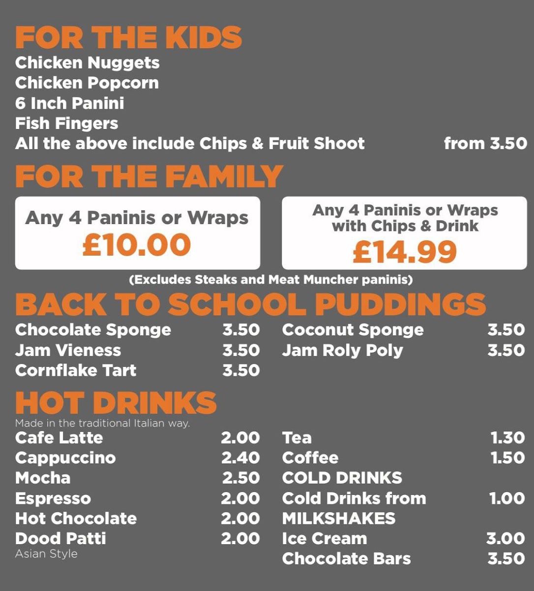 For those seeking warmth, the cafe offers a selection of hot drinks, including rich Cappuccinos and decadent Mocha, perfect for pairing with a sweet treat from their ice cream and chocolate bars selection. Families are welcomed with a kids menu featuring fun options like Small Paninis and Fish Fingers.
